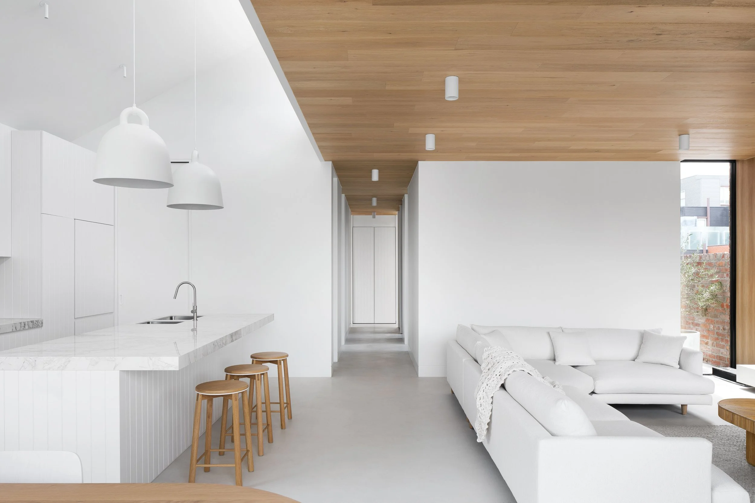 Throughout the interiors, accents of engineered timber panelling in a light, wire-brush finish bring an air of softness and warmth to the otherwise crisp, minimalist aesthetic in which X-Bond Microcement is a key element.